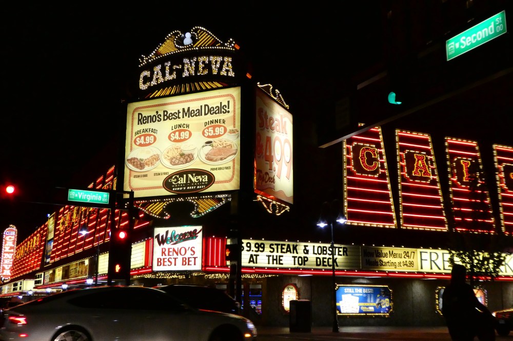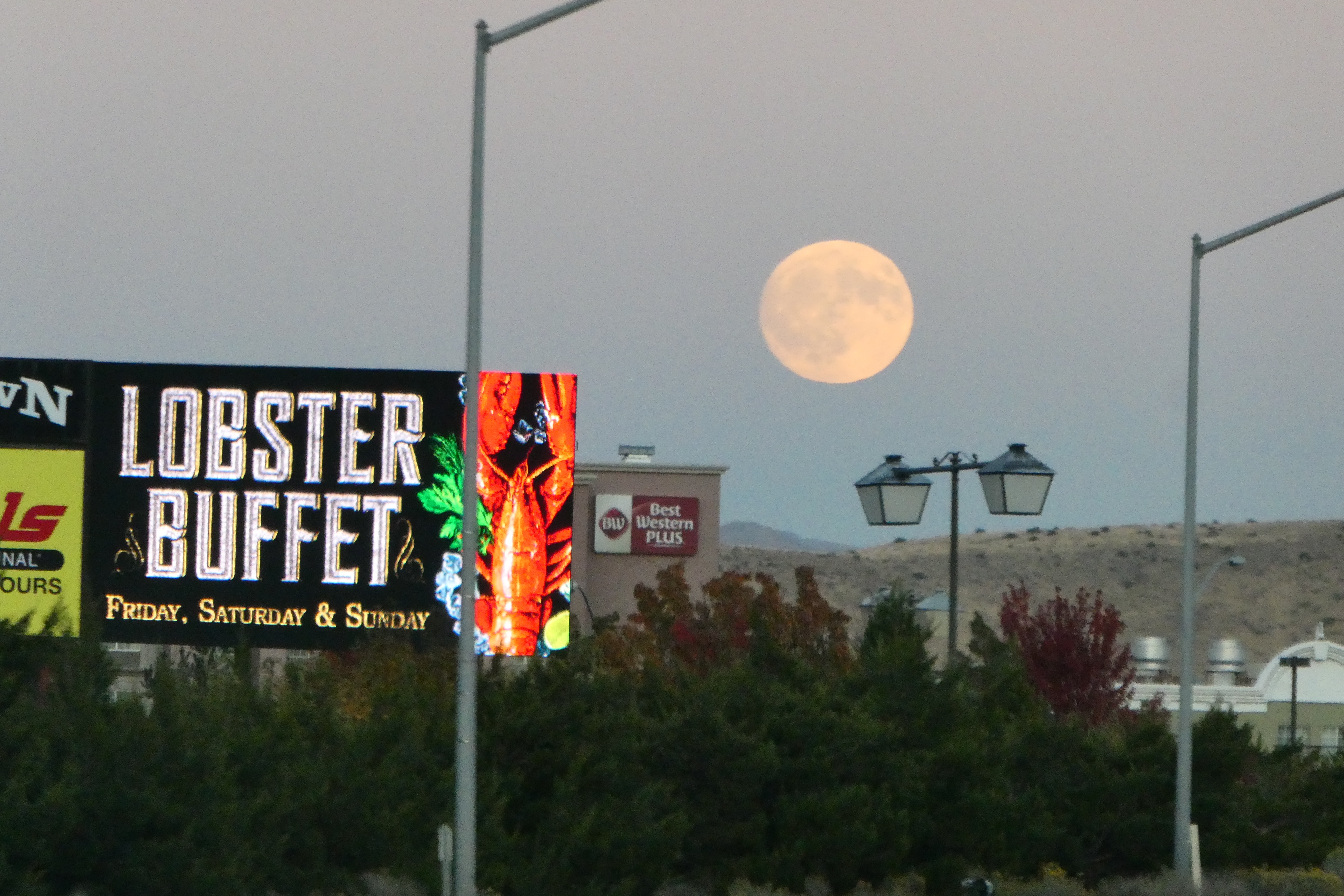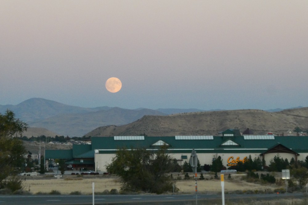Just passed through Reno on our way to Bozeman, Mt. The moonrise was spectacular and the lights of Reno were perfect for a few drive-by shots. Now, here I am in the car. Husband is driving and I have the full moon over my shoulder. The shots tonight are without any post-editing — not even a little cropping. This is what happens when I have promised to post a picture every day.